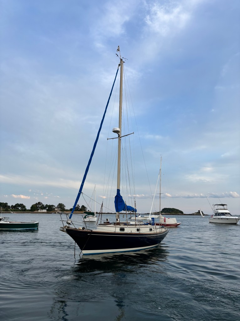 Yesterday, with the engine commissioned and sea-trials complete, the Sloop John B putted over from Marblehead to Manchester. Sloop John B now rests at home on the mooring!